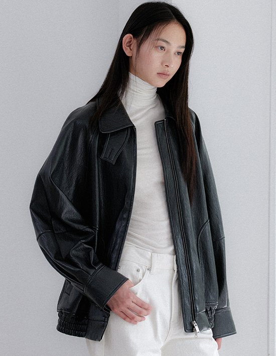 클래식함을 동시에 느낄 수 있는 비건 가죽으로 만든 봄버 자켓.