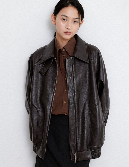 클래식함을 동시에 느낄 수 있는 비건 가죽으로 만든 봄버 자켓.
