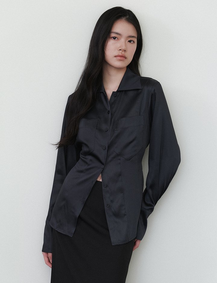 단단하지만 광택감 있는 실키한 소재의 슬림핏 셔츠형 블라우스.