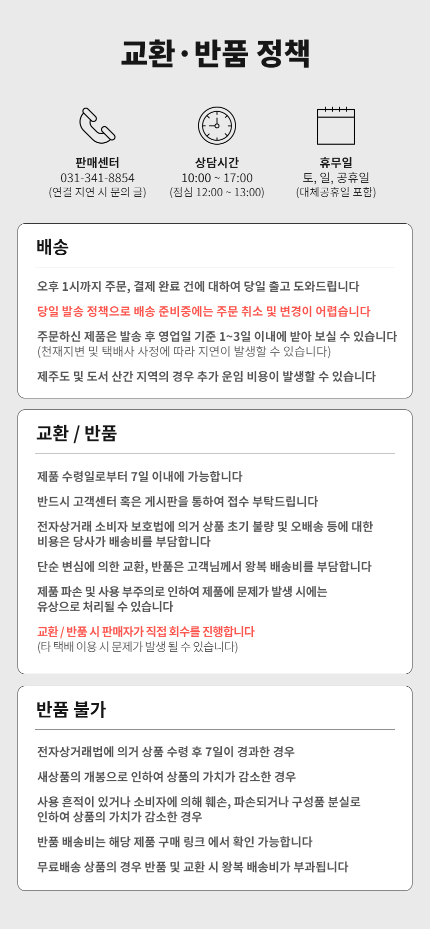 다음에 해당하는 교환·환불 신청은 처리가 어려울 수 있으니 양해 부탁드립니다. 고객님의 책임 있는 사유로 상품이 멸실되거나 훼손된 경우 (단, 상품의 내용을 확인하기 위해 포장 등을 훼손한 경우는 제외)고객님의 사용 또는 일부 소비로 상품의 가치가 감소한 경우시간이 지나 다시 판매하기 곤란할 정도로 상품의 가치가 감소한 경우복제가 가능한 상품의 포장이 훼손된 경우고객님의 주문에 따라 개별적으로 생산되는 상품의 제작이 이미 진행된 경우반품 신청 후 14일 내에 물품이 반환되지 않고 고객님과 연락이 되지 않는 경우