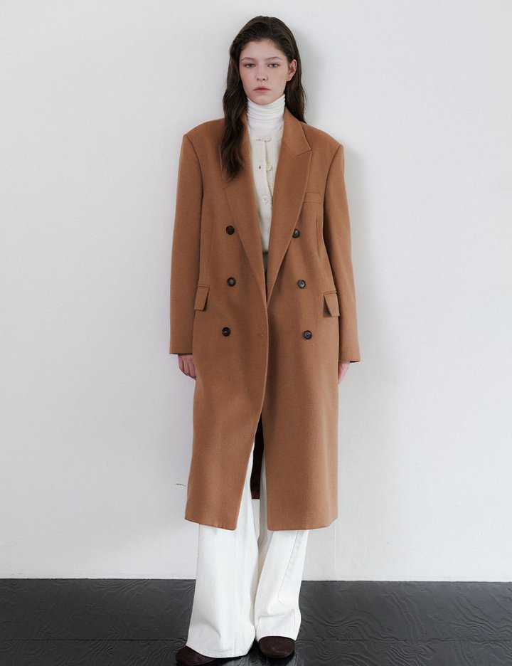 숄더가 강조된 오버핏 더블 블레이져 롱 코트.