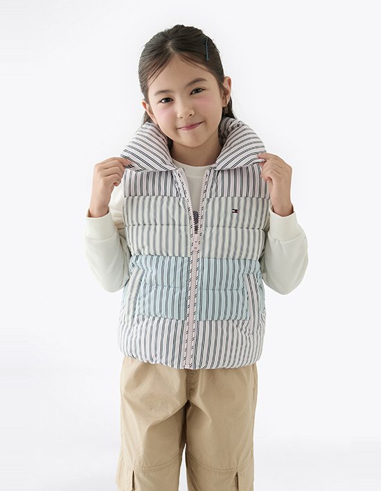 스트라이프 패턴과 감각적인 티어드 컬러 배색으로 유니크한 스타일을 연출하는 패딩 베스트입니다.<br>가벼운 나일론 겉감과 폴리에스터 충전재로