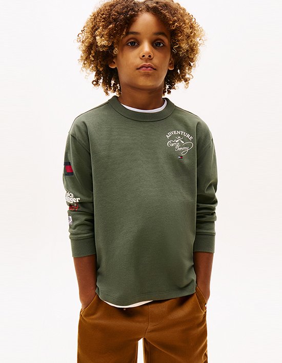 Fit 아카이브 핏 부드러운 피치드 가공 면 100% 소재로 제작된 아카이브 핏 긴팔 티셔츠입니다. 캠프 타미 로고 프린팅이