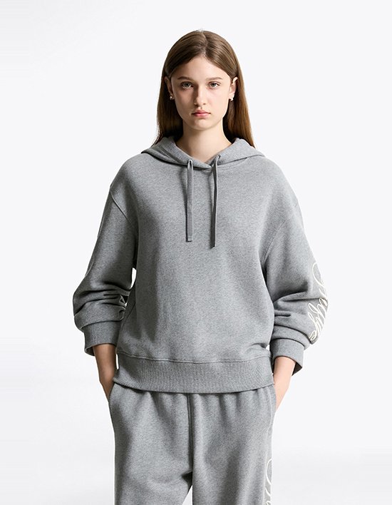 Fit 레귤러 핏 부드러운 촉감의 테리 원단으로 제작된 레귤러 핏 후디입니다. 편안한 착용감은 물론, 한쪽 소매에 더해진 스