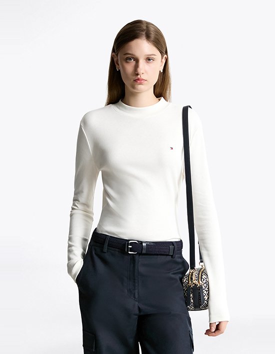Fit 슬림 핏 신축성 좋은 1X1 골지 립 코튼 원단으로 제작된 슬림 핏 모크넥 롱 슬리브입니다. 몸에 자연스럽게 밀착되는