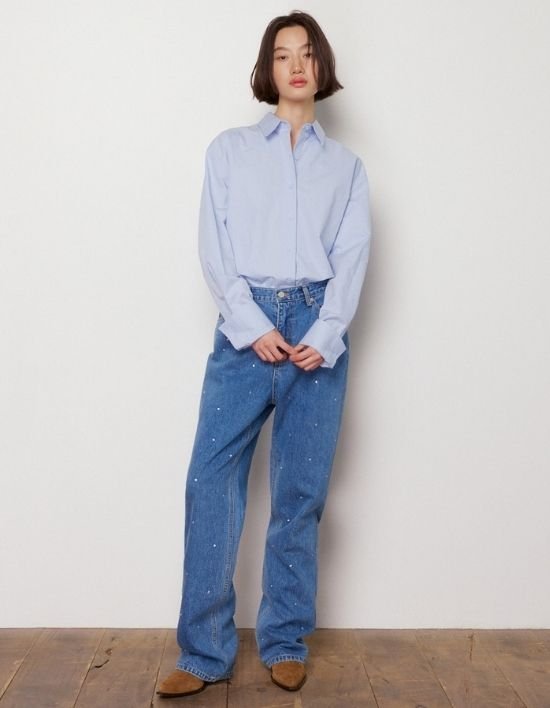[오쿠카] 샤이니 와이드 데님 팬츠 - 블루