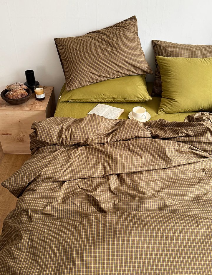 올리브 카키 그린 컬러와 블루 믹스 체크패턴이 유니크한 올리브 베딩입니다. 선염 체크 면100% 제품으로 부드럽고 색감이 유니크해 흔하지 않은 느낌으로 스타일링 하고 싶은 분들께 추천 드립니다.