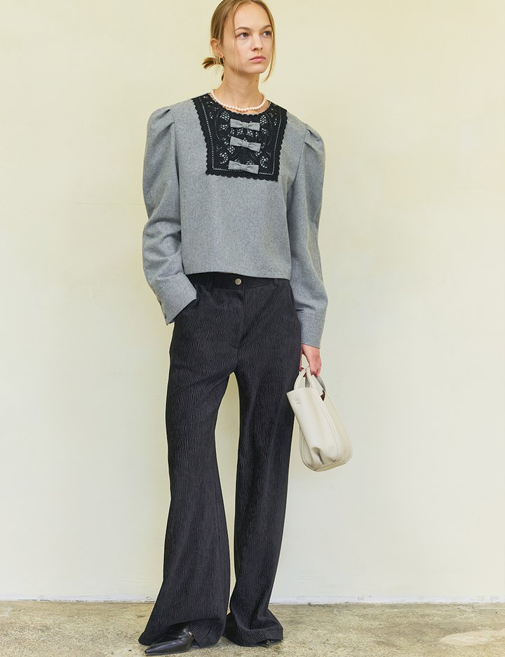 벨벳 소재를 머신 플리츠로 정교하게 가공해 물결 라인을 따라 촘촘한 주름이 살아 있어요. 차르르 흐르는 핏으로, 슬림하고 자연스러운 실루엣의 세련된 겨울 팬츠를 제작했습니다. 허리에는 무광 니켈 금속 단추를 사용해 작은 디테일까지 세심하게 마무리했어요.