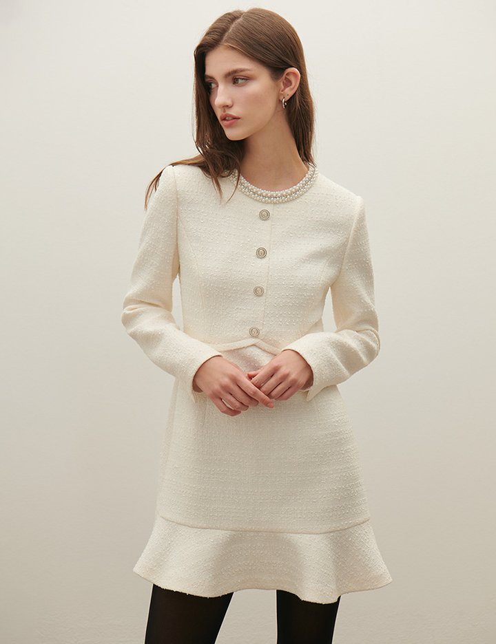 [샤틴] 진주 트리밍 트위드 플레어 원피스 O254T604