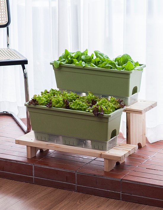 15리터 중형용량 텃밭화분으로 투명 물받이가 있어 하루이틀 물을 주지 않아도 흙이 마르지 않는 저면관수 디자인