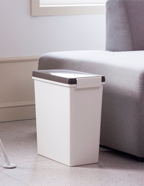 휴지통의 캡에 밀폐용기에 사용되는 실리콘을 넣어 냄새를 완벽하게 차단. 전면 잠금장치로 인해, 사용중 휴지통이 쓰러저도 뚜껑이 열리지 않음. 고양이, 강아지, 유아 기저귀 처리에 적합