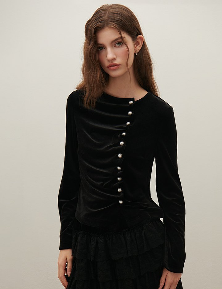 [샤틴] 진주단추 벨벳 블라우스 S254M255
