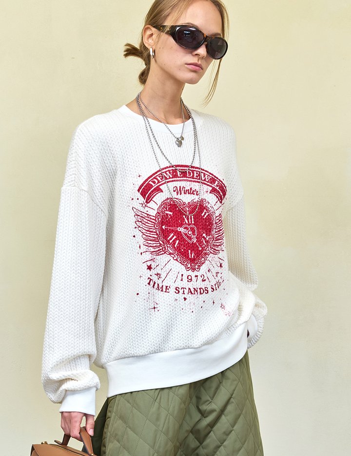 겨울에도 빈티지 프린트를 예쁘게 즐기고 싶은 마음으로 만든 니트 소재 스웻셔츠입니다. 넉넉한 사이즈에 오버핏으로, 루즈하게 떨어지는 니트 소재 덕분에 부해 보이지 않고 여리여리한 핏을 완성했어요.
