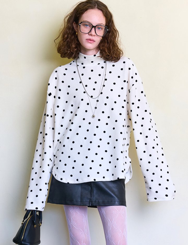 벨루아 특유의 부드럽고 은은한 광택감과 도트 무늬가 만나 더욱 매력적인 아이템이에요. 포근한 촉감으로 겨울 내내 편안하게 착용할 수 있답니다. 반하이넥은 원단을 두 겹으로 사용해 자연스럽게 처지면서도 넥 라인을 예쁘게 잡아줍니다.