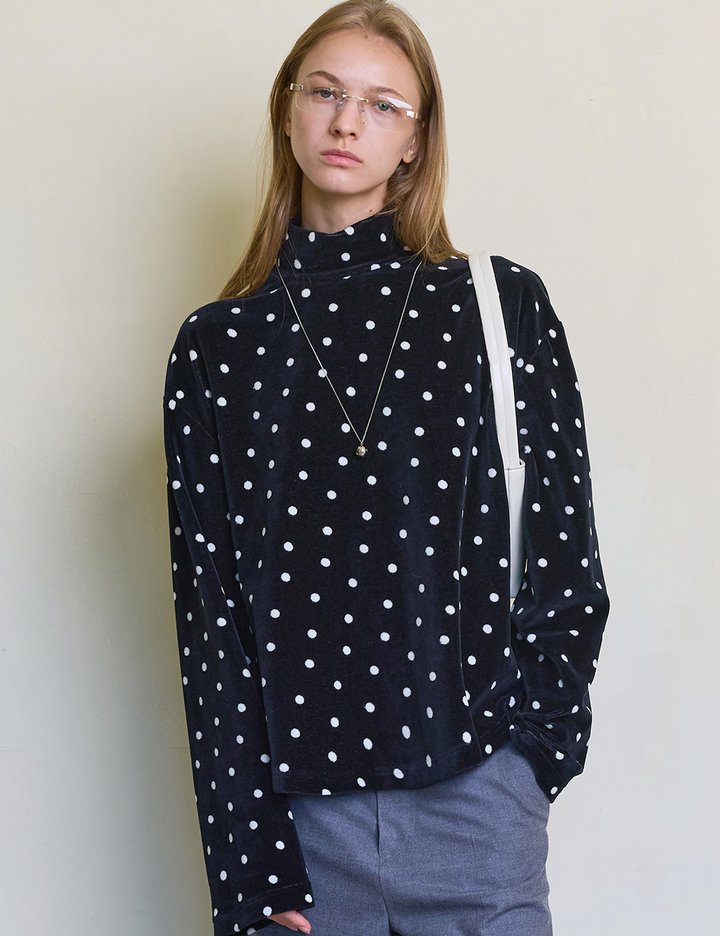 벨루아 특유의 부드럽고 은은한 광택감과 도트 무늬가 만나 더욱 매력적인 아이템이에요. 포근한 촉감으로 겨울 내내 편안하게 착용할 수 있답니다. 반하이넥은 원단을 두 겹으로 사용해 자연스럽게 처지면서도 넥 라인을 예쁘게 잡아줍니다.