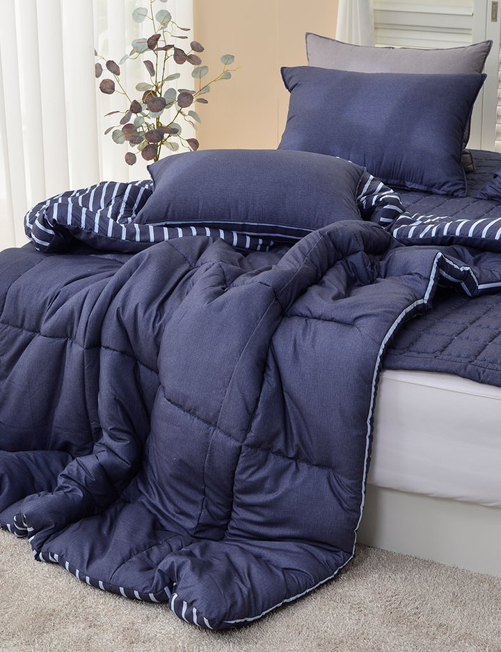 도톰한 퀼팅과 세미 마이크로화이바 소재로 먼지 걱정 없이 부드럽고 포근하며 양면 사용 가능한 리버시블 사계절 차렵이불