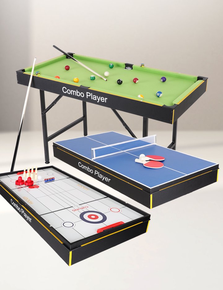 온가족이 5가지 게임을 즐길 수 있는 아리프 시그니처 테이블 게임, 포켓볼 탁구 볼링 컬링 하키 상판과 부속품 모두 올인원 제공, 다리를 접을 수 있어 보관도 편리해요.