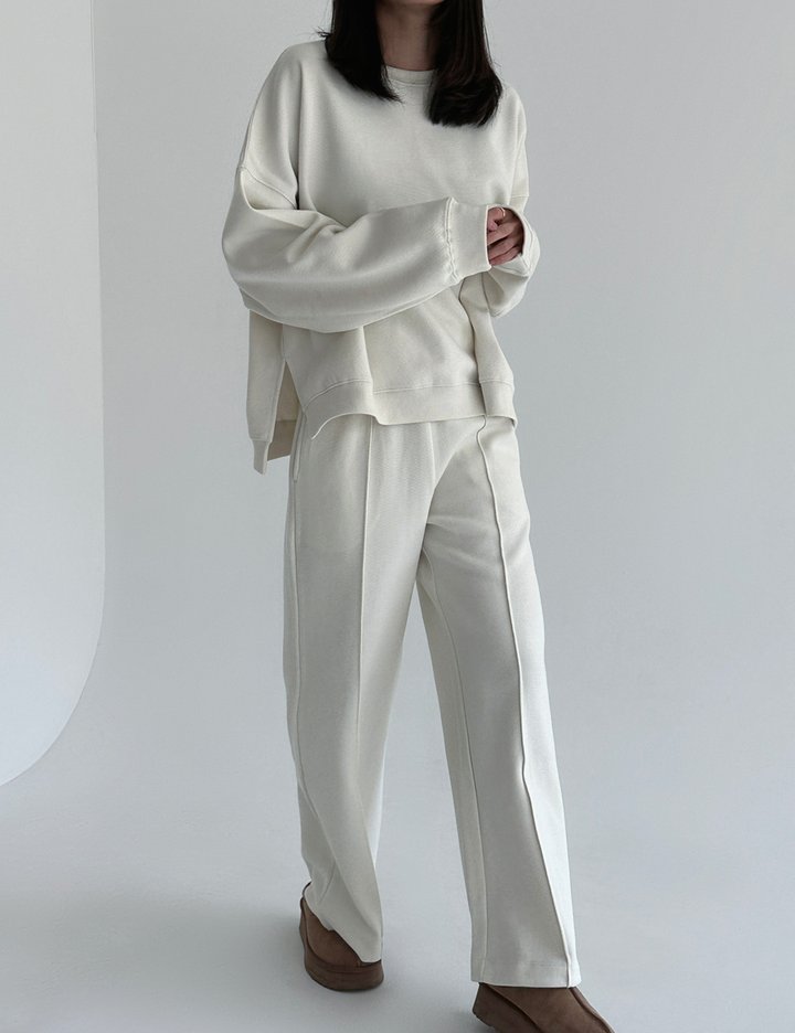 담백한 실루엣에 고급 PK소재로 완성된 바이듀 감성의 맨투맨 팬츠 셋업