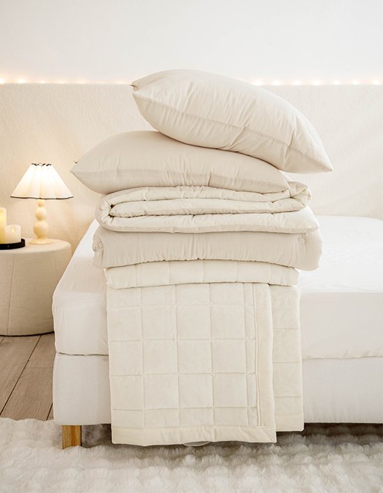 특허 받은 발열솜으로 따뜻해요! / 양면 다른 소재로 제작되어 활용도 GOOD! / 풀세트 구성 (차렵이불+패드+베개커버)