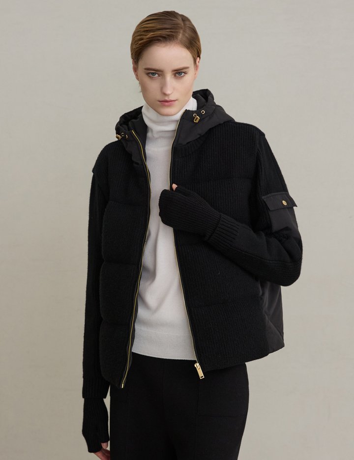 울 90%, 캐시미어 10% 혼방의 고급 원사로 완성된 후드 패딩 니트