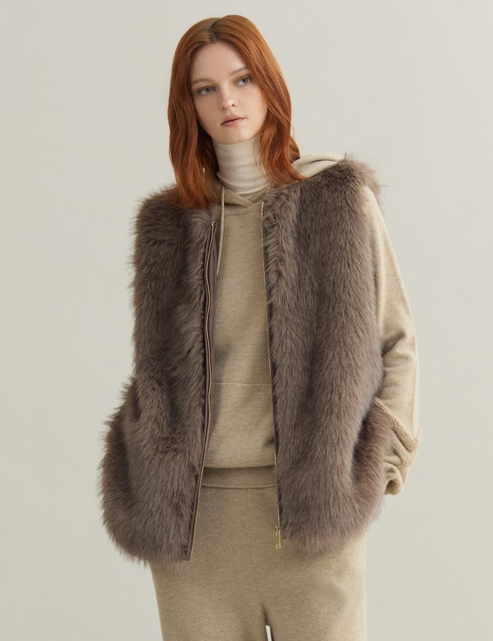 부드럽고 풍성한 텍스처의 페이크 퍼로 완성된 지퍼업 베스트