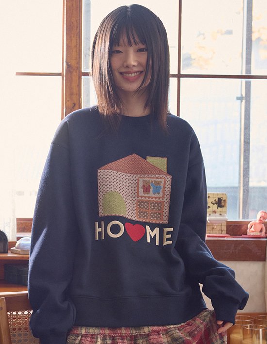 '집에 있어도 집에 가고싶어' 집을 사랑하는 집순이 곰돌이들이에요. 자수로 패치 느낌을 표현한 빈티지한 매력이 있는 아플리케 맨투맨