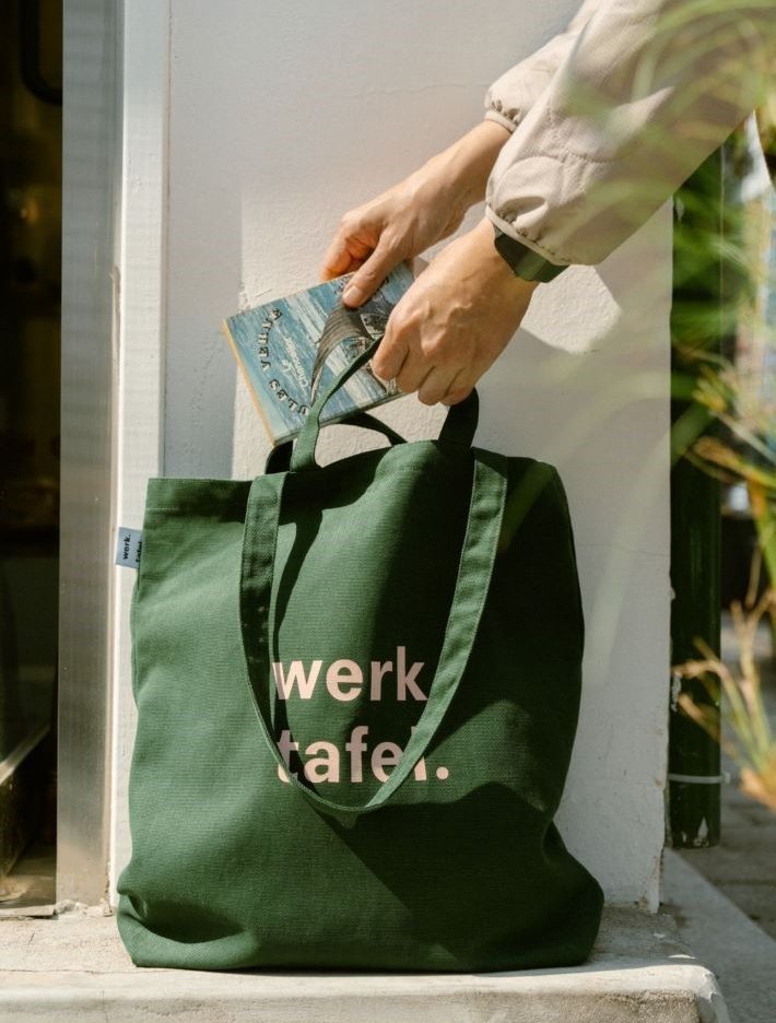 원단과 프린트 컬러가 조화로운 토트와 숄더 겸용의 베르크타펠 대표 로고백
