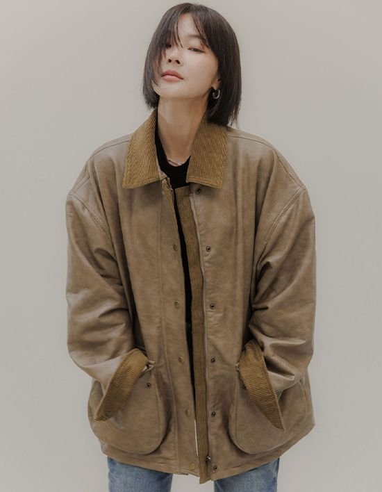 [메무아] Monet Crack Leather Corduroy Jacket(올리브베이지)