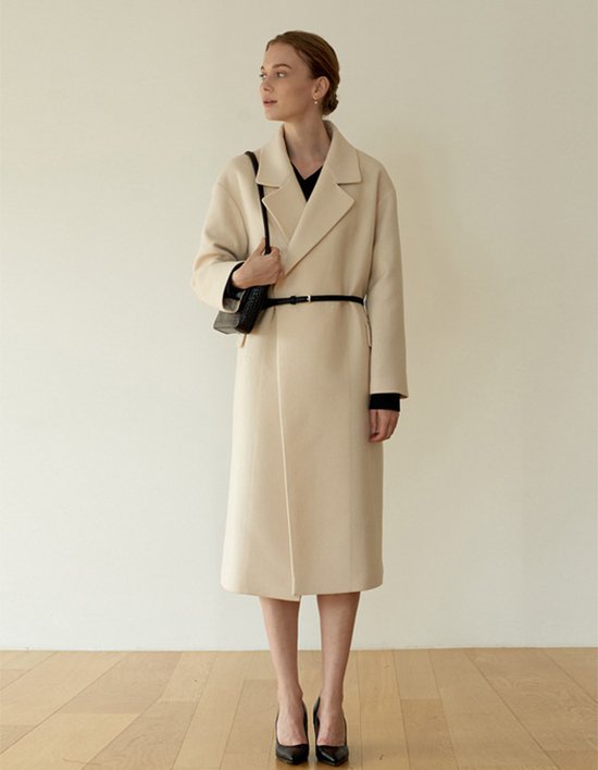 크림컬러가 돋보이는 울 소재의 라운드 숄더 라인이 특징인 루즈핏 클래식 코트 입니다.