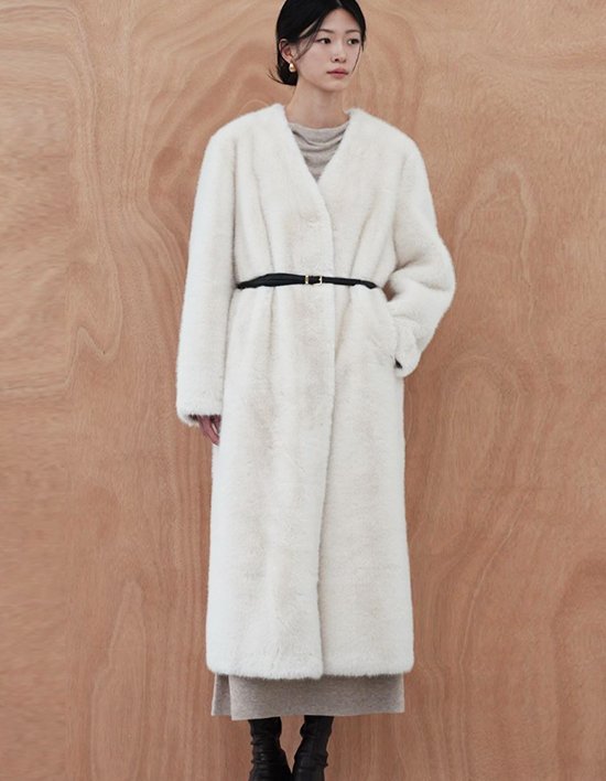 넓게 떨어지는 브이넥으로 얼굴선을 세련되게 정돈하며, 엉덩이를 덮는 기장과 볼륨감으로 독립적인 아우터로 활용 가능합니다. 포근한 페이크 퍼와 매트한 스웨이드 터치로 보온성과 착용감을 높인 연말룩 겨울 시즌 필수 아이템