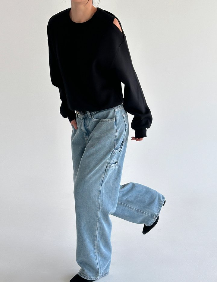 한쪽 어깨 라인에 트임을 더해 포인트되는 맨투맨