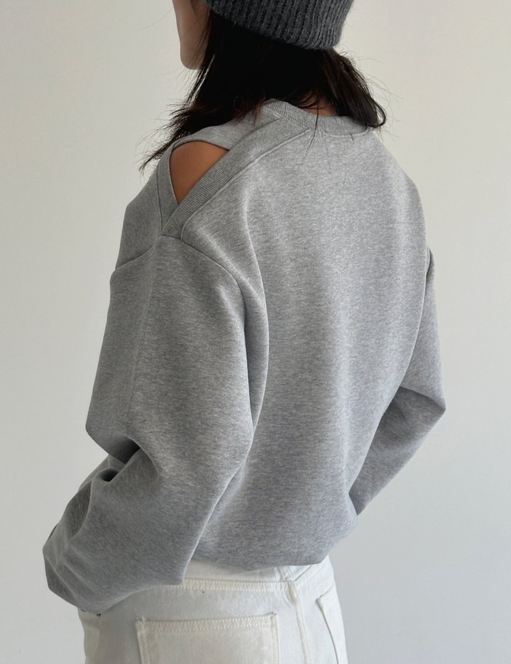한쪽 어깨 라인에 트임을 더해 포인트되는 맨투맨