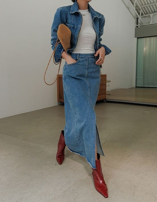 [메무아] 레인 데님 자켓 롱스커트 셋업