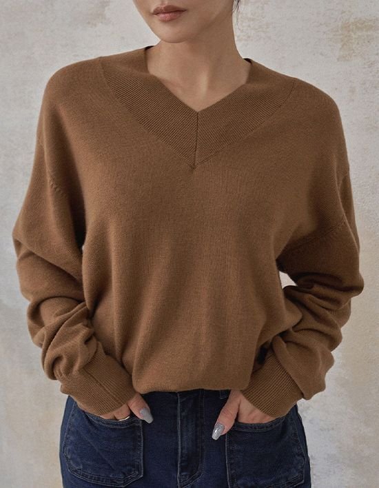 [메무아] 슈퍼파인 메리노울 브이넥 니트(카멜베이지)