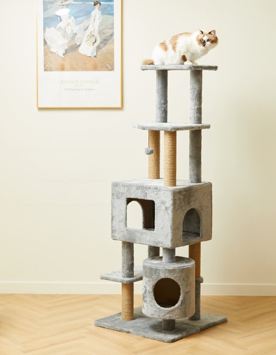 [펫토리아] 한층뚝딱 고양이 원목 그레이 플러시 6단 대형 캣타워 스크래쳐 162cm