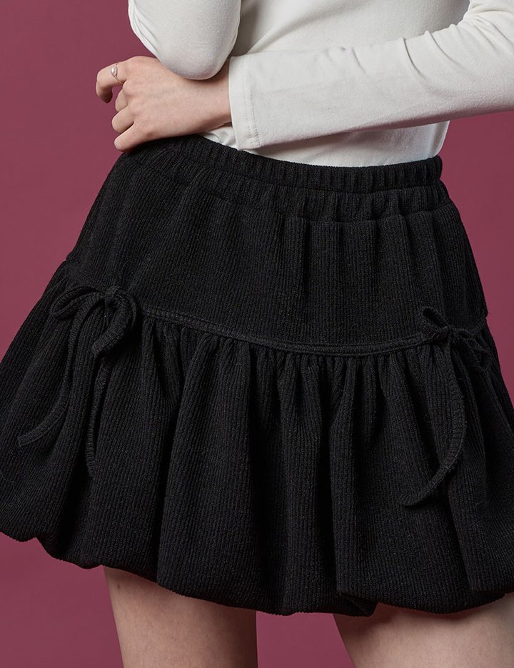 방한 니트 벌룬 리본 플레어 밴딩 미니스커트 [BLACK] 치마바지 ver.