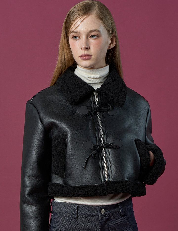 크롭 리본 비건 양털 무스탕 플리스 자켓 [All_Black]