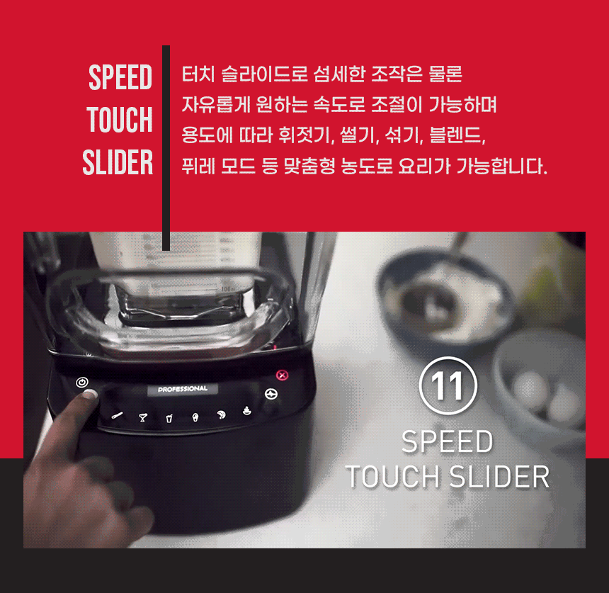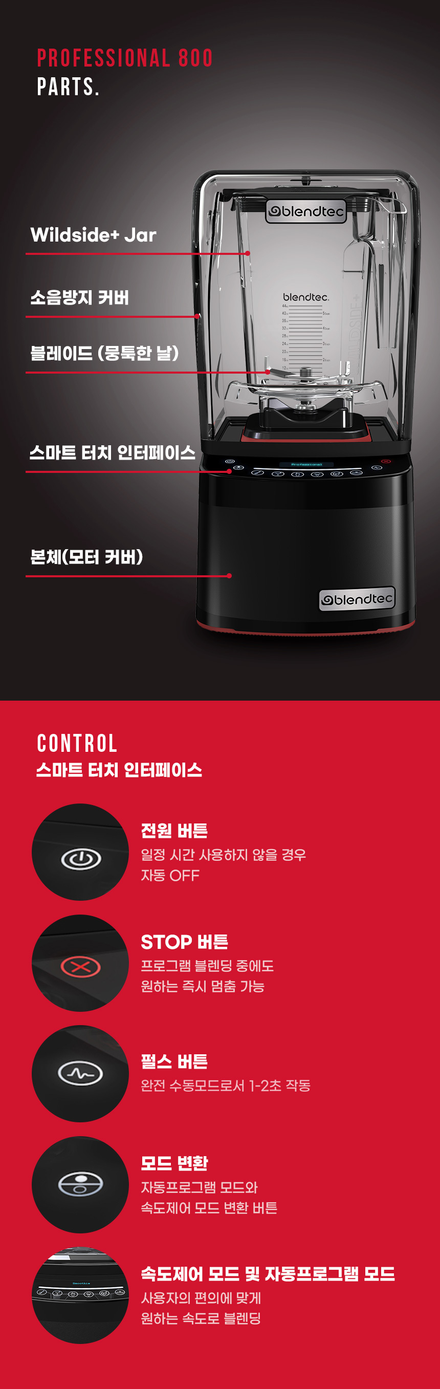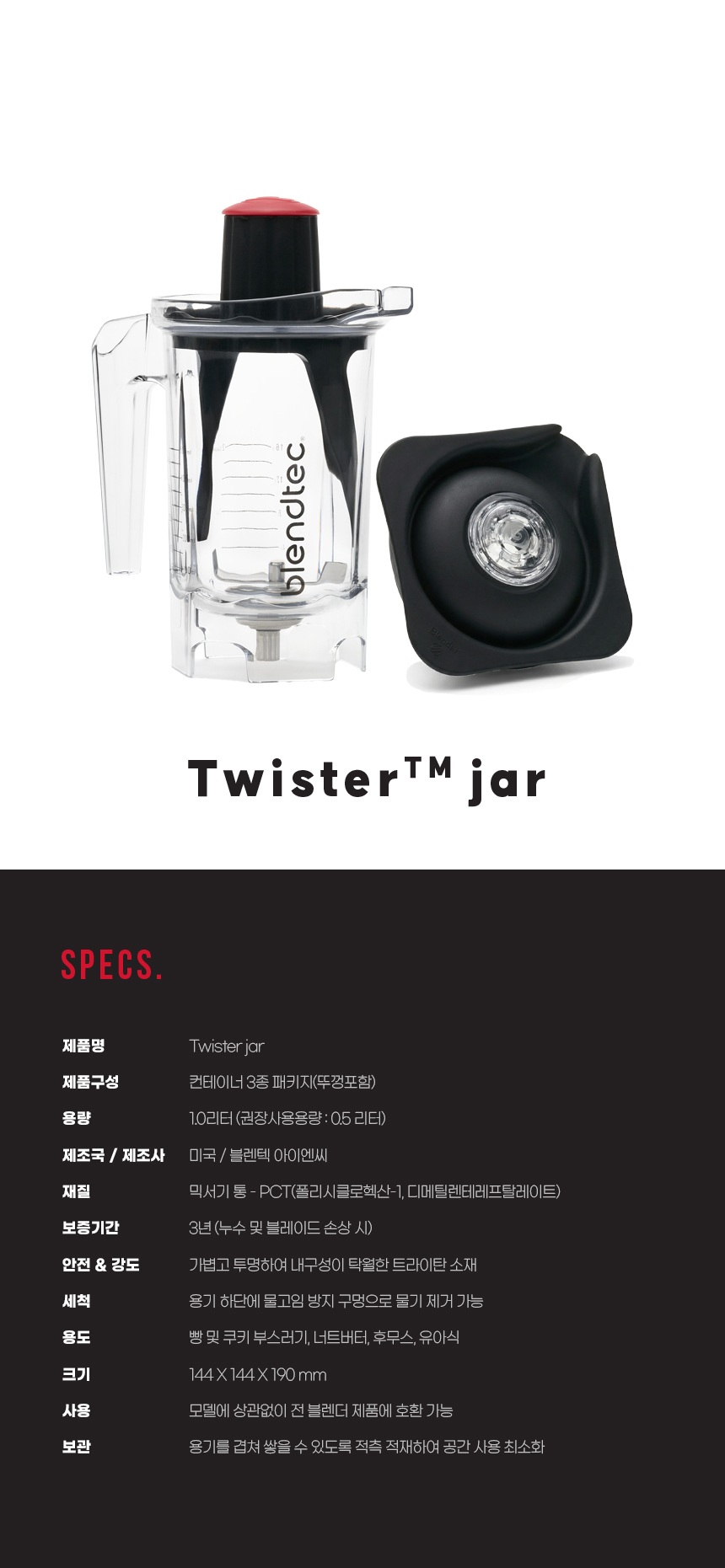 제품크기 : 216 x 232 x 428mm/ 무게 : 약 7.35kg/ 용량 : 와일드 사이드 플러스 자 2.6L(권장용량 : 1.1L) 3.8마력, 6가지 프로그래밍, 11단계 정전식 터치 속도 조절 + 펄스 기능, 방수등급 : IPX1