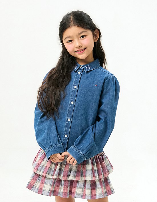 은은한 블루 데님 소재로 제작되어 깔끔하면서도 캐주얼한 분위기를 연출합니다.<br>칼라 부분에 플라워 자수가 부드럽고 사랑스러운 포인트를 더하