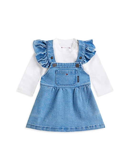 코튼 혼방 소재의 스트레치 데님 덩가리 드레스로, 신축성이 좋아 활동 시에도 편안한 착용감을 제공합니다.<br>긴팔 티셔츠와 세트 구성으로 실