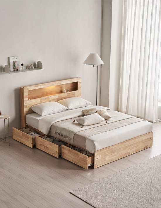 [스칸디아]레임 3단 빅서랍 LED 원목 수납 침대(SS/Q)