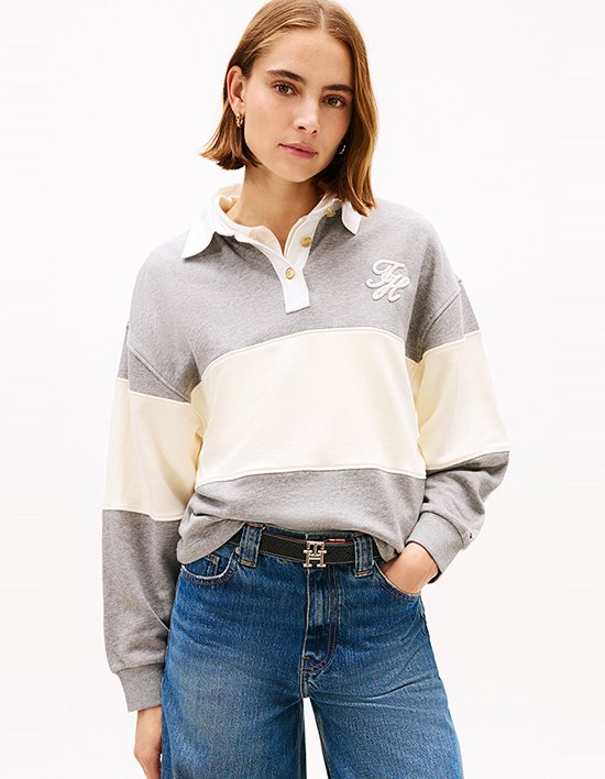 컬러 블록 디자인의 럭비 스웨트 셔츠로 스포티하면서도 클래식한 무드를 동시에 연출합니다.<br>골드 크레스트 버튼이 포인트가 되며, 왼쪽 가슴