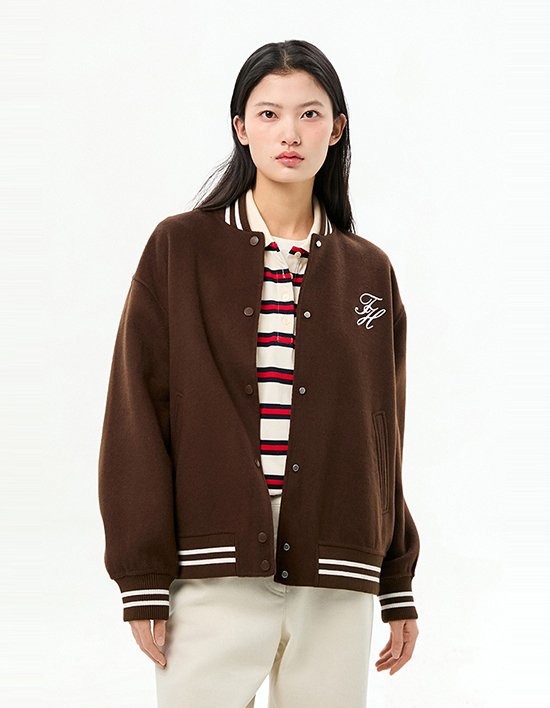 울 혼방 소재로 제안하는 클래식한 바시티 무드의 봄버 재킷입니다.스냅 버튼 여밈의 바시티 실루엣으로 캐주얼하면서도 안정적인 스타일링이