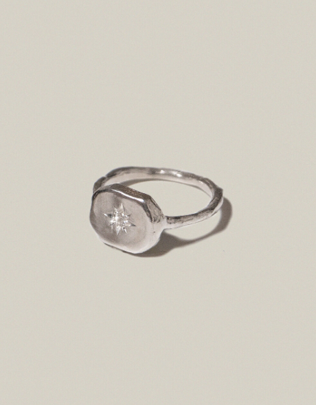 다듬어지지 않은듯한 러프한 형태에 화이트 스톤이 핸드카빙으로 세팅된 반지. Ancient Wish Collection은 고대에 사람들의 염원을 담거나 소망을 빌었던 주술적인 장신구에서 모티브가 된 컬렉션 입니다.
