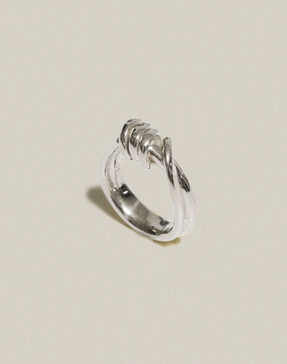 얇고 굵은 은선이 엮여 있는 모양의 링입니다. 볼드한 곡선으로 이루어져있어 묵직한 포인트가 됩니다.