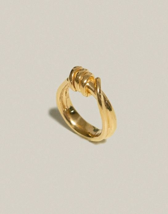 얇고 굵은 은선이 엮여 있는 모양의 링입니다. 볼드한 곡선으로 이루어져있어 묵직한 포인트가 됩니다. 실버에 18k 도금이 되어있습니다.
