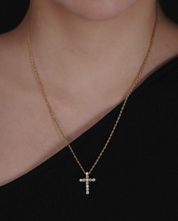 빛나는 광채의 모이사나이트가 세팅된 크로스팬던트입니다. 빈티지하고 고급스러운 실버 로프체인에 골드도금이 되어있으며, 남녀 모두 착용하실 수 있는 디자인 입니다. 2.5mm 모이사나이트 11개가 세팅되었습니다.