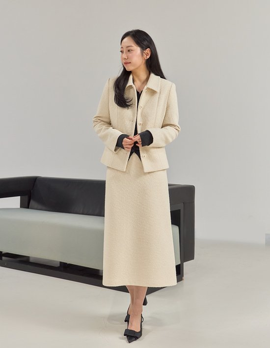 트위드 텍스처가 매력적인 포인트 스커트에요. 유연하면서 뒤 허리밴드로 편하게 착용 가능해요