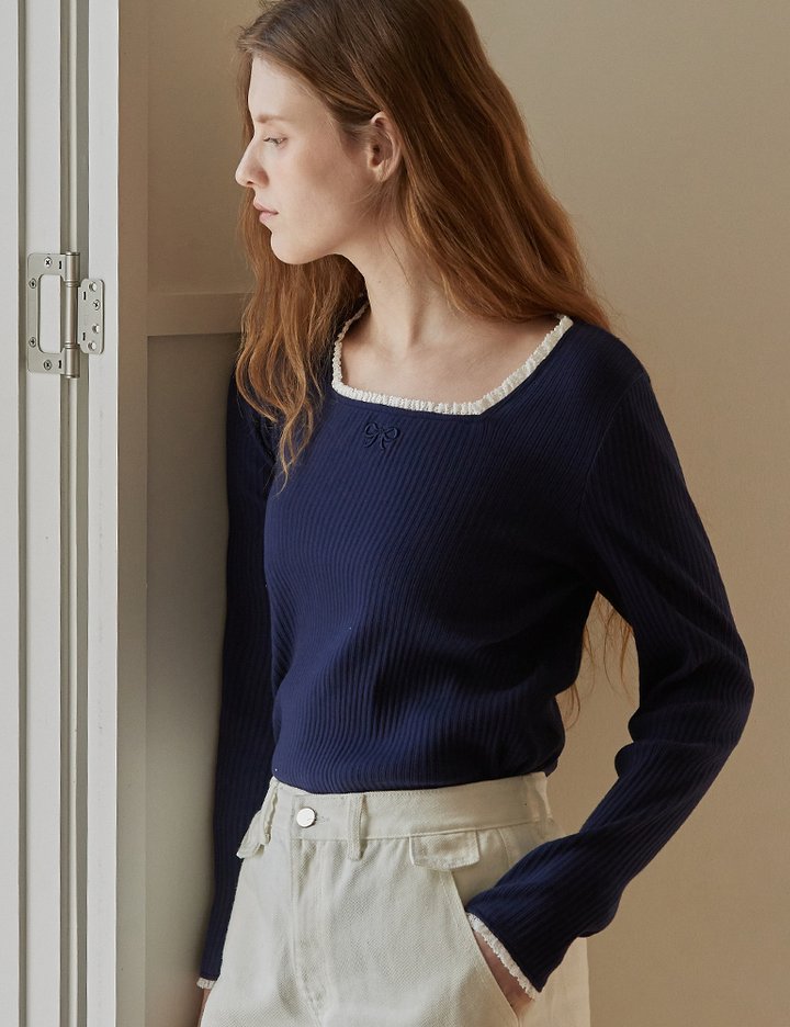 [비뮤즈맨션] 리본 포인트 스퀘어넥 탑 네이비