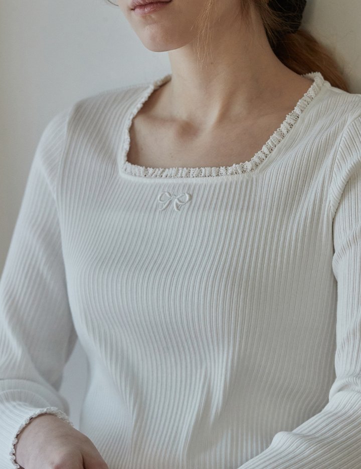 [비뮤즈맨션] 리본 포인트 스퀘어넥 탑 오프화이트